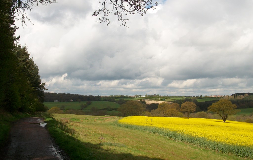 Looking north to Brinsley and Underwood from track by High Park Wood. The situation is nicely depicted in DH Lawrence’s early (1910) story The Shades of Spring. A young man, Addy, who was brought up in this district on the Derbyshire/ Nottinghamshire border, but who has now moved away, is revisiting his old haunts. He is walking through the woods to the farm where his ex-sweetheart, Hilda, lives, but in the wood his path is blocked by a young gamekeeper: