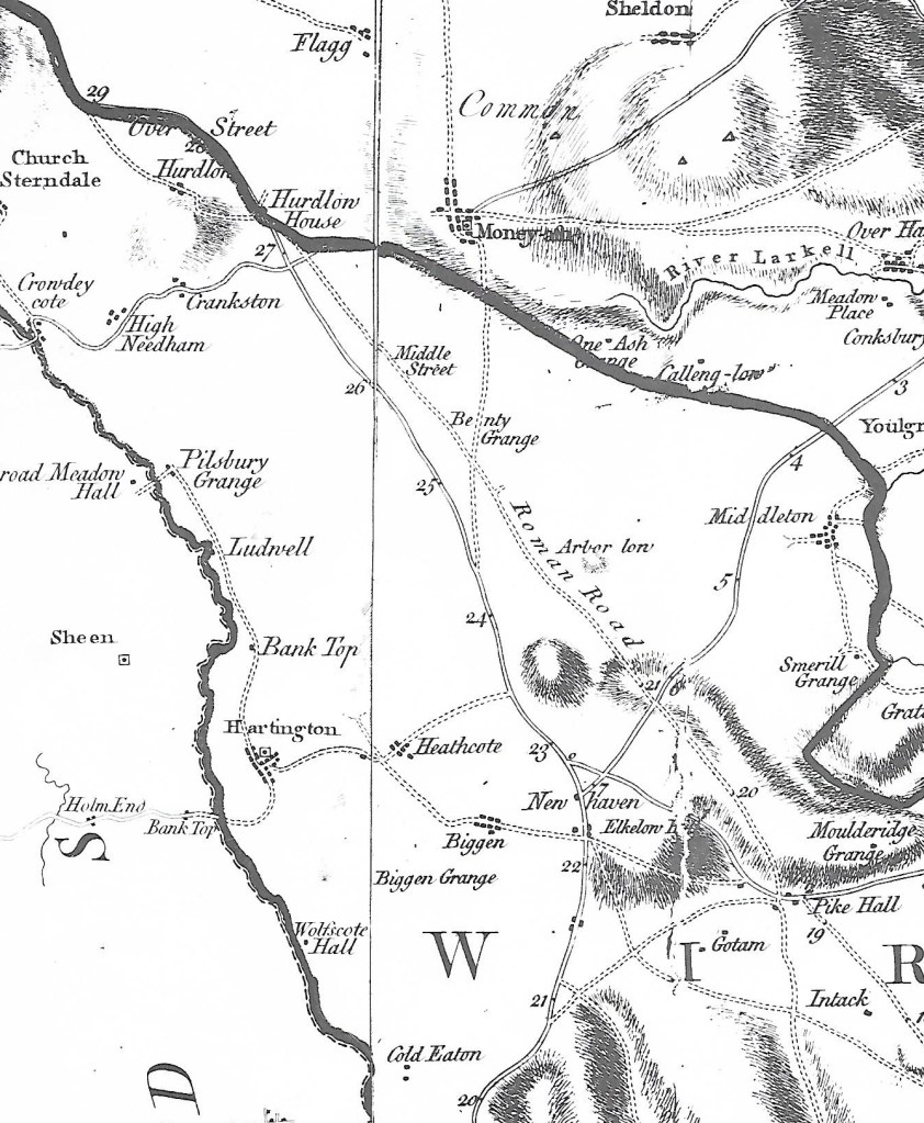 Something not mentioned by English Heritage is that a Roman road ran through this area just 100 metres away, south east from Buxton, and that this probably followed the line of an older ridgeway. A henge monument on the scale of Arbor Low must have attracted visitors for (presumably) seasonal festivals from all over the district, and so the proximity of the henge to the road is not mere coincidence. It can be seen that the eighteenth-century turnpike did not follow the exact route of the older road, which remained in use until the time of Burdett’s map, but which has now disappeared except as a parish boundary. Overall the route presents a classic example of a road that may be at least four thousand years old, starting as a ridgeway serving the henge and other sites nearby, then being re-engineered by the Romans, and more recently re-routed as a turnpike road.