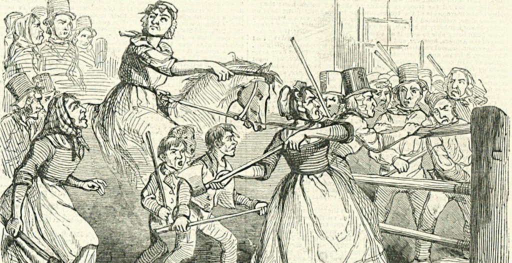 Despite these exemptions, ordinary people commonly hated the turnpikes, which seemed to take away a basic freedom – to use the ‘King’s highway’ without paying. This was especially the case in Wales, where an agricultural depression between 1839-42 caused widespread misery. This lead directly to the Rebecca riots, when protesters disguised themselves in women’s clothing and attacked and burned the toll gates, which had come to represent the general burden of taxation on the poor.