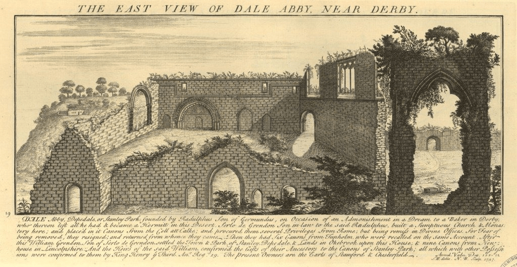 Compared with neighbouring Yorkshire, Derbyshire has hardly any visible remains of its abbeys. Even the location of Darley Abbey in Derby is uncertain, while Dale Abbey, between Ilkeston and Ockbrook, has just one solitary surviving arch (see below). The engraving above shows the state of the ruins in the eighteenth century, before the robbing of dressed stone had been completed. Yet at its height in the fifteenth century this abbey owned about 24,000 acres of land, throughout the county and beyond; endowments it had accumulated over the years. With only about 15 canons in residence, the job of administering these estates may have been given to lay people, but this task must have involved constant travelling. In addition, abbeys like Dale attracted pilgrims who came to pray before relics, in this case a phial of St Mary’s milk. For both reasons, Dale Abbey must have been sited on a good long-distance route.