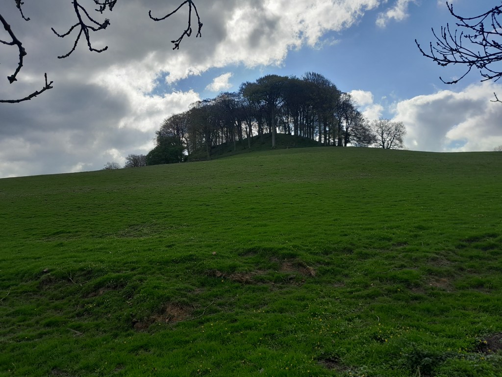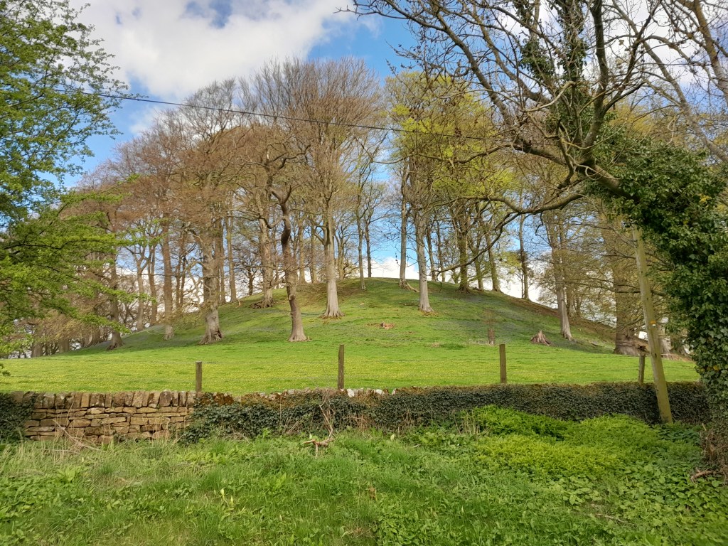 Peak Tor is a steep, tree-crowned hill between Rowsley and Stanton. It is best seen from the north side of the Wye valley, on the old road to Bakewell, from where the ditch and bank earthworks are clearly visible. I walked the site on a chilly April morning, when geese were honking on the river and early swifts were swooping through the ancient trees. The footpath from Rowsley runs past the earthworks and then crosses a narrow valley to reach the hamlet of Pilhough. There are wood anenomes, bluebells and celandines in the grass and a cold wind from the east.