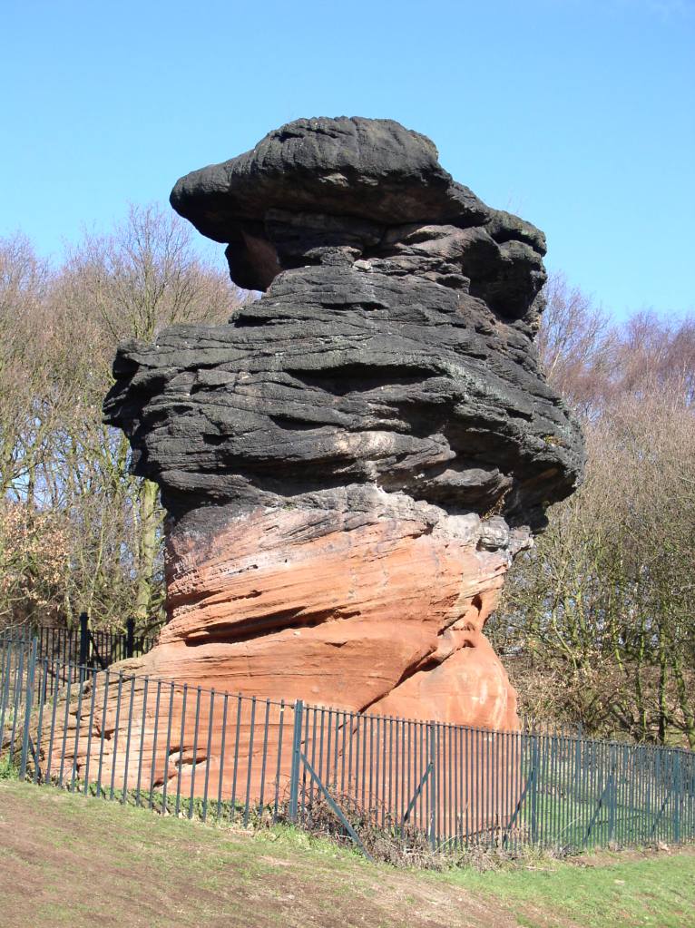 The Hemlock Stone on Stapleford Hill west of Nottingham is a sandstone pillar about five metres high, set in parkland. The name suggests that it may have acted as a boundary marker between Derbyshire and Nottinghamshire, and it is found near the Portway’s crossing of the Erewash (the county boundary). It seems to have had more significance in the past, with eighteenth-century references to its use for Beltane celebrations, and was famous enough for DH Lawrence to include it in Sons and Lovers as the destination for an Easter walk.