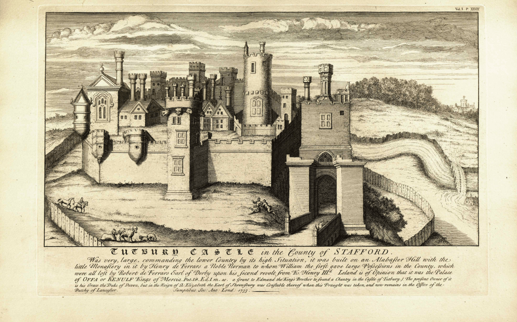 When Mary, Queen of Scots escaped from the rebellious Scottish lords in 1568 to find shelter in England, she could not have imagined that she would spend the next 18 years as a prisoner of her first cousin once removed, Queen Elizabeth. The Earl of Shrewsbury had the misfortune to be chosen as her jailer, and he found himself caught between Mary’s complaints about the quality of her prisons and Elizabeth’s (justified) suspicions of her cousin’s intentions. For most of her imprisonment she was kept at his houses and castles in Sheffield, Hardwick, Chatsworth, and Wingfield, with regular visits to Buxton, but initially she was confined in Tutbury Castle, just over the River Dove in Staffordshire.
