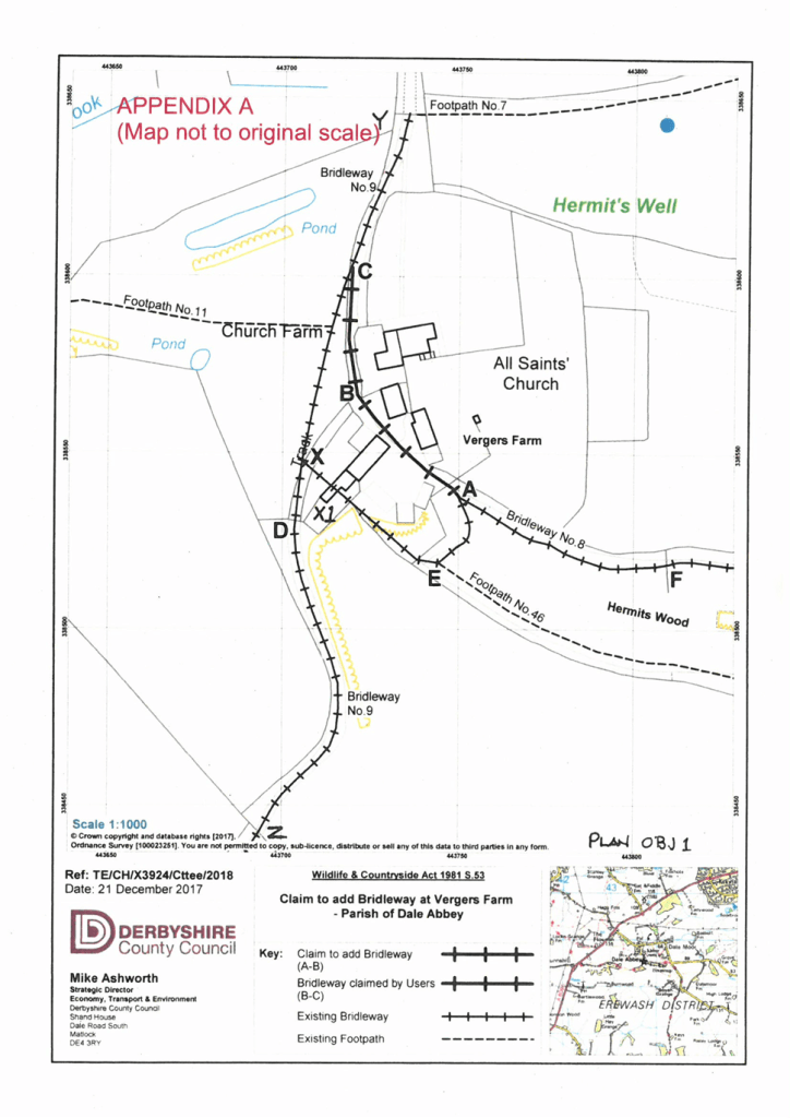 This case illustrates the extraordinary passions that a right of way dispute can generate. The bridleway in question is only a few hundred metres long, but caused an argument involving dozens of people, the parish council, the county council (DCC) and Defra, which continued for over four years. Now that the way is officially waymarked, we should recognise their efforts by visiting the village; either walking from the Carpenters’ Arms in Dale village or taking the more ambitious route along field paths from the Royal Oak in Ockbrook.