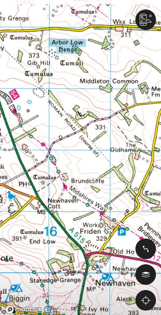 Ryknild Street was the only long-distance Roman road that crossed Derbyshire, coming from Lichfield to the camp at Little Chester and then on to Chesterfield. Part of its route is still used today, notably the A61 from Higham through Stretton and Clay Cross to Chesterfield. There is little trace of the first part, through Breadsall and up to Brackley Gate, but then the route is picked up by Golden Valley and runs very straight to Smithy Houses and Street Lane. This last name, of course, and the village of Stretton, are reminders that Roman roads were always ‘streets’. Ryknild Street is the name given on the OS map, but there are many variations of the spelling, and this name was almost certainly not used by the Romans. The map above, of the area around Pentrich, is one place where public footpaths give access to the line of the road.
